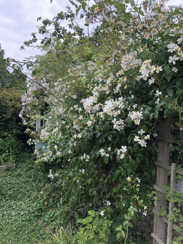 Der ganze Garten duftet. Jetzt sind tatsächlich alle meine etablierten Rosen am Blühen. Auch Kiftsgate hat sich bequemt. Dahinter ist Paulchen zu sehen, der gerade meine Philosophie beginnt zu umgarnen