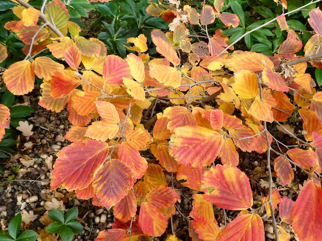 Meine bei den Schneeglöckchentagen als 'Pallida' gekaufte Zaubernuss (O-Ton Gärtnerei Blütenreich: "Die echte!" - Ist womöglich die anderswo auch als 'Fred Chittenden' gehandelte Sorte gemeint?) fängt immer schon recht früh mit der Laubfärbung an, dieses Jahr Ende September/Anfang Oktober. Manchmal schillert das Laub in allen Regenbogenfarben, manchmal ist es glutrot, dieses Jahr eher orangerot, womöglich ist dies von den Witterungsbedingungen und von der Bodenfeuchtigkeit abhängig. Dieses Jahr ist sie wirklich übersät mit Blütenknospen, das wird im kommenden Jahr ein Feuerwerk!