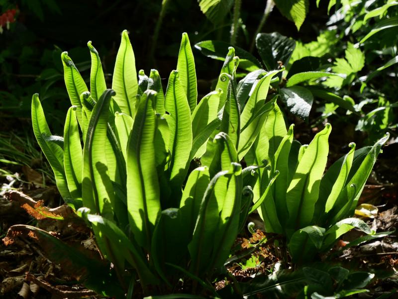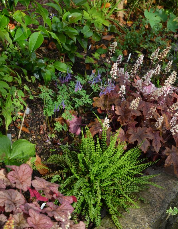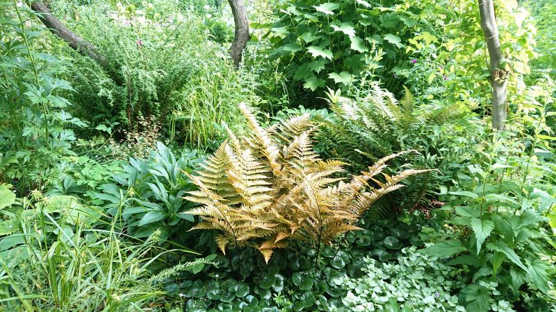 Farne finde ich ganz toll. Leider bleiben nicht alle, ich probiere sie durch. Der normale Wurmfarn aus dem Wald hält die trockenen Sommer jedenfalls aus. Darüber sieht man noch Zierapfel und Holunder.