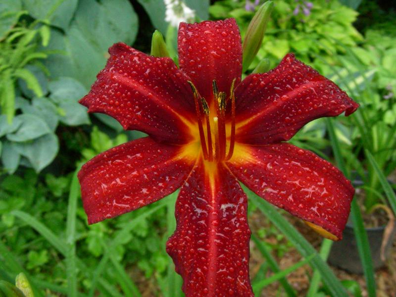 Ich habe vor 2?3? Jahren mal bestäubt, ich meine, die Mutter war Marietta Dreamer (hatte sie neu und war so bezaubert) - der Vater könnte, v.a. bei meiner eingeschränkten Auswahl damals Mateus sein.Nun gabs die erste Blüte - und die besser geöffnet und nach Regen besser in der Substanz als namhafte Sorten, die daneben stehen (Highland Lord, Hermitage Galen, Council of Elders und Berlin Red Velvet sowieso), und hat ein anderes Rot, in der Nuance mehr an Grape Velvet erinnernd.Mir gefällt er so erstmal gut, dieses Rot hätte ich ohne ihn nicht, duften tut er leider nicht: