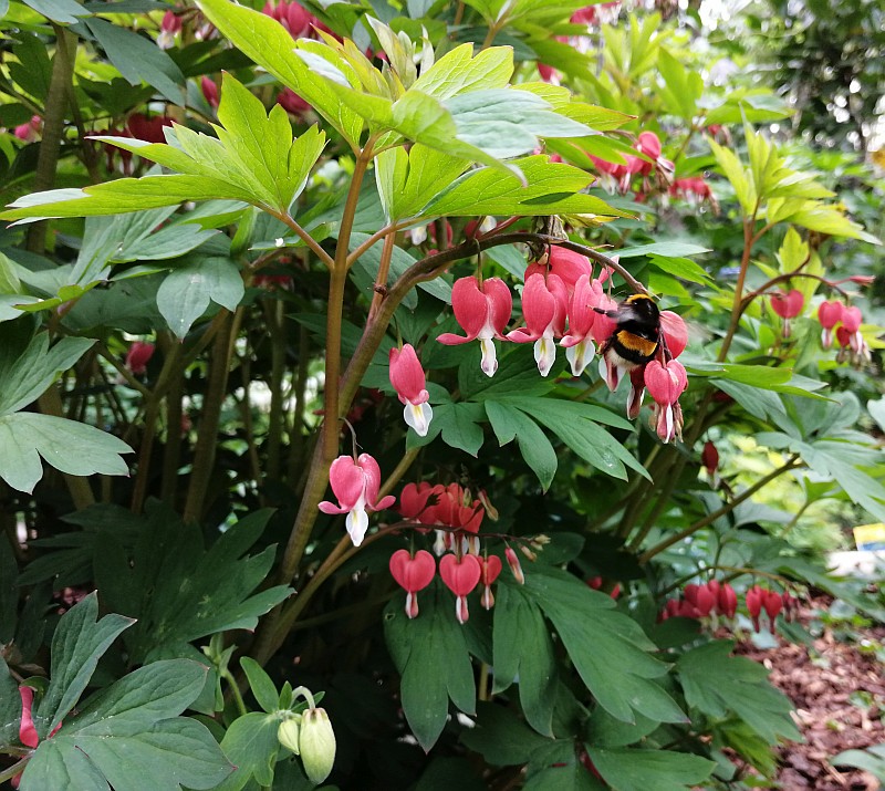 Dicentra spectabilis 'Valentine': Ausschnitt mit Blüten und Brummer.