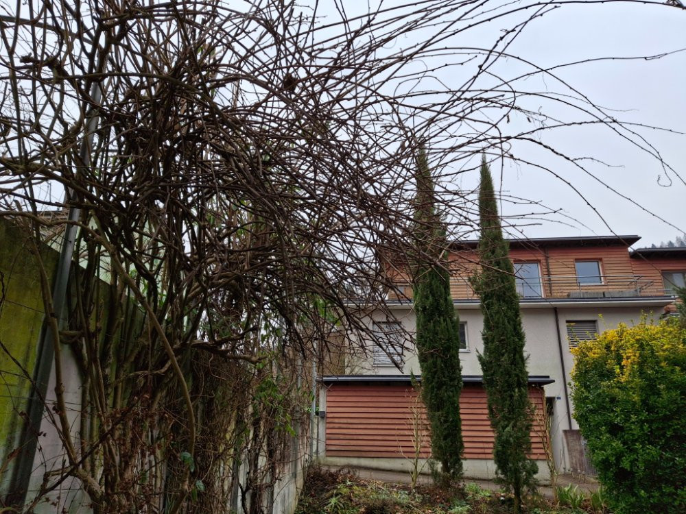 Ich habe einen 25 Jahre alten Kiwi, den ich bisher immer äusserst dilettantisch selbst geschnitten habe. Als er gepflanzt wurde, sollte er in 1. Linie die hässliche 2,5 m hohe Betonmauer verdecken. An der Mauer ist ein Pergolagerüst montiert, das über den hinter der Mauer liegenden Weg geht. Diese Pergola ist von der anderen Seite des Weges her mit Glyzinien bewachsen und der Kiwi soll dort nicht hineinwachsen. Da die Sommer immer heisser wurden, fand ich es eine gute Idee, das obere Ästegewirr in Richtung Garten stehen zu lassen, dass sich ein Schattendach bildet. Tja, die langen Triebe haben dann durch ihr Gewicht das Ganze nach unten gezogen: Die Betonwand war nicht mehr zu sehen, aber es war dann doch zuviel Schatten.