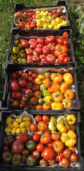 Kann Dir nur Recht geben - hier ein Teil meiner heutigen Ernte:Schluß jetzt mit BF-Gejammere und Ekelbilder, schließlich habe ich auch noch die hier zu bietenHeutige Ernte von Kübel- und Gewächshauspflanzen:Die 2 Dicken links sind Old Germans, oben Mitte Tomatenpaprika, oben leicht rechts Marvel Stripe, oben ganz rechts NyagousMitte: Costoluto Genovese, rechts davon kleine Copia und ganz rechts wieder NyagousUnten: links sollte Graf Batthyány (Fleischtomate) sein, ist es wohl aber nicht... Green Sausage und rechts AngorasMacht in Summe nochmals ca. 3 KG