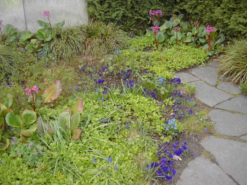 Und nein, es ist nicht unvollendet. In der großen "leeren" Mitte kommt in Kürze Epimedium und im vorderen Bereich ist ein Teppich aus Waldsteinia. ;) In deren dichten Rhizomteppiche ließen sich keine Hornveilchen pflanzen.