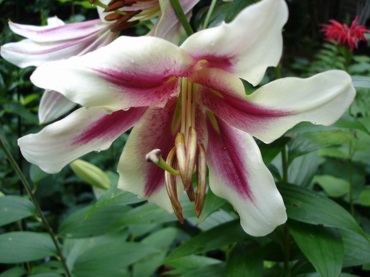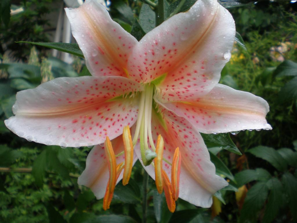 Vor einigen Jahren habe ich noch "Mischpackungen" verschiedener Lilien im Supermarkt mitgenommen, und dabei nur darauf geachtet, dass die Zwiebeln ordentlich aussahen. Natürlich kam nur ein Bruchteil von ihnen schon im ersten Jahr. Einige sind mittlerweile eh ganz weggeblieben, aber einige wenige haben sich nun in diesem Jahr doch zu einer (oder wenigen) Blüte(n) bequemt. Aber wie heißen die denn nun? Ausgehend von den etwas rundlichen, größeren Blättern meine ich, dass es Orientalis- oder OT-Hybriden sein müssten. Hier erstmal eine Rosafarbene, die auch etwas duftet: