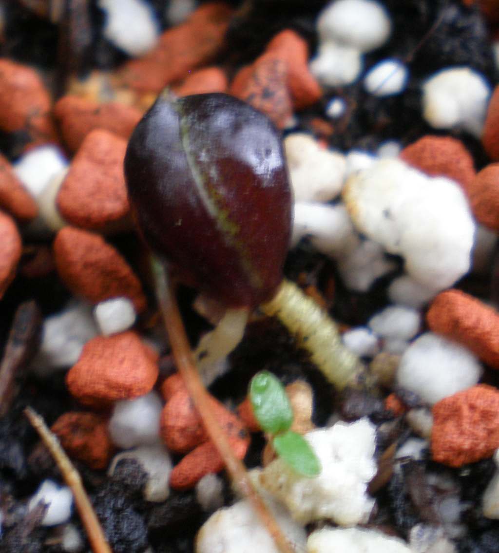 Interessant ist es zu sehen, wie die Achselbulbillen nun Würzelchen treiben. Ich weiß aber nicht, von welcher Lilie diese Bulbillen stammen, da sie nicht geblüht hat. Ich habe sie als Lilium species käuflich erworben.Die ersten Bulbillen von L. bulbiferum wackeln auch nicht mehr auf bzw. zur Häfte in dem Substrat (ich habe sie ein wenig ins Substrat gedrückt), wenn ich vorsichtig kontrolliere, ob sie sich noch bewegen lassen.Ein schärferes Foto schaffe ich nicht, aber man sieht die beiden Würzelchen ganz gut.