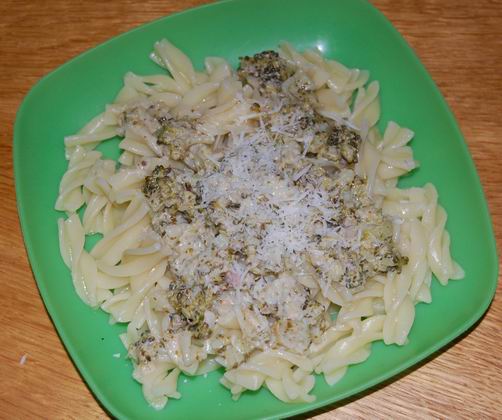 Dienstag ist bei mir Nudeltag:Fusilli mit Grüner Soße (Broccoli, Knobi und Frischkäse) und Parmesan.