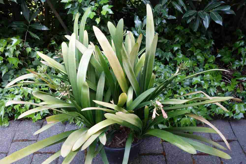 Nachdem meine Clivien im Januar schon geblüht hatten, hatte ich sie im April auf die Terrasse gestellt, wo sie jeden Sommer stehen. Da wir das Dach vom Pavillon noch nicht aufgezogen hatten, hatten die Clivienblätter massiven Sonnenbrand.Ich wollte die Pflanzen, hässlich, wie sie waren, entsorgen.Beim Kompost sah ich, dass beide Knospen schoben. Also hab ich nur die vertrockneten Blätter abgeschnitten und sie wieder auf die Terrasse gestellt.Sie haben mir mit tollen Blütenbällen gedankt.