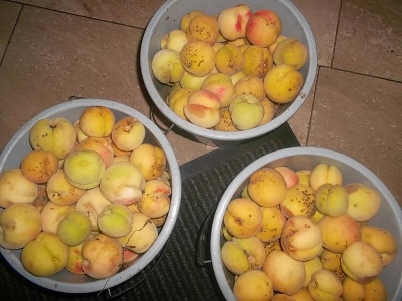 Wir haben heute vorerst nur Fallobst "geerntet": Pfirsiche einer unbekannten Sorte (vor 10 Jahren aus einem Kern gezogen) und Äpfel "Retina".