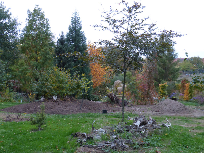 Gestern wurde noch gar keine Erde bewegt, nur alles von Bewuchs befreit. ;) Der Erdhaufen, der schon auf dem ersten Bild zu sehen ist, ist der Aushub von der Pflaster-Baustelle am Teich. Der Hügel, aus dem die Haselnüsse schauen, war früher ein Totholz- und Asthaufen, den wir irgendwann mit Grassoden abgedeckt haben. Das kommt Kompost inzwischen schon recht nahe. ;)