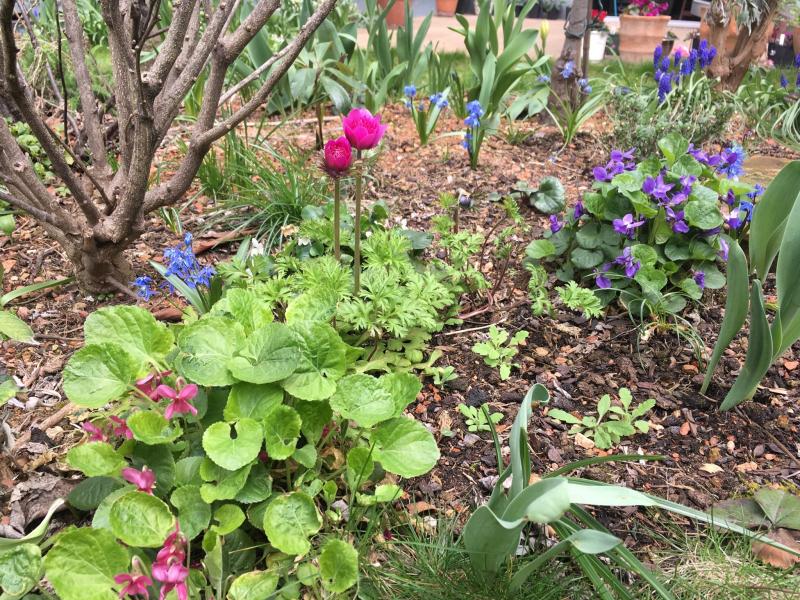 Ich hoffe die Buschwindröschen breiten sich hier bald aus, vereinzelt blühen sie schon. Jetzt aber eine andere Anemone. A. coronaria mit Viola odorata