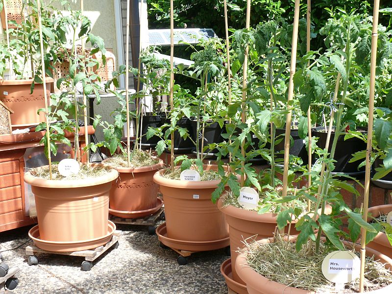 Tomatenpflanzen im Garten. Warum nicht ein paar Töpfe im Hochbeet verstecken?