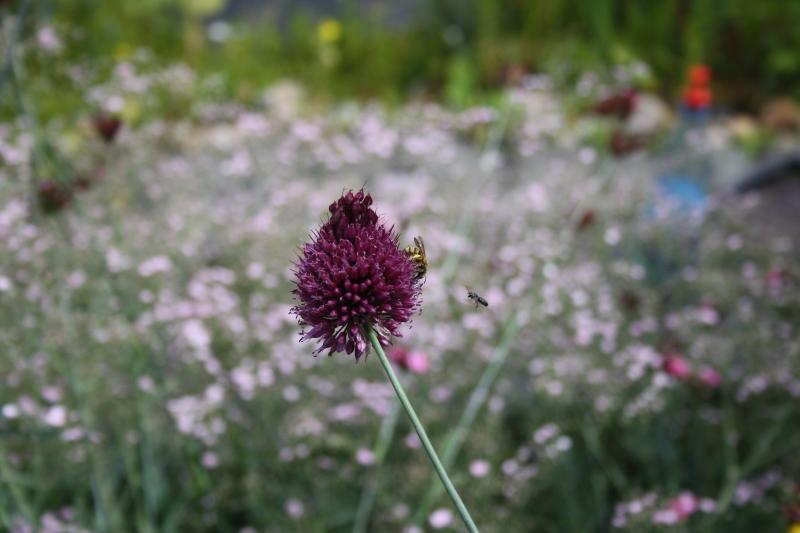 Noch zwei weitere Bienen sind mir an einer Alliumblüte aufgefallen. Eine sieht aus wie eine kleine Wespe und eine ganz winzige ist total Schwarz. Leider kenne ich mich bei Bienen gar nicht aus. Vielleicht kann die jemand erkennen.