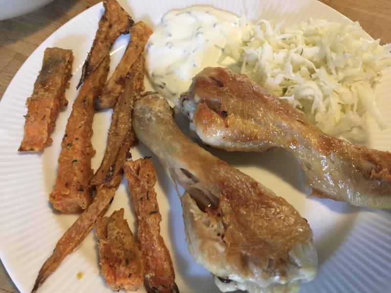 Gebratene Hühnerunterschenkel mit knusprigen Süßkartoffel-Pommes, Sour cream und Rettichsalat.