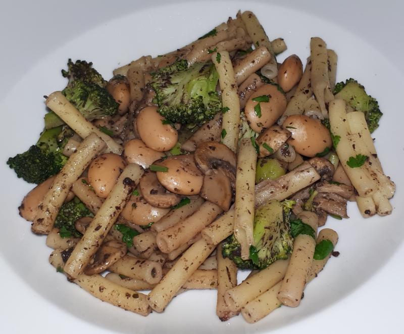 Maccheroni mit Champignons, Brokkoli und weißen Bohnen, Olivenpaste, Parmesan und frischem Koriander