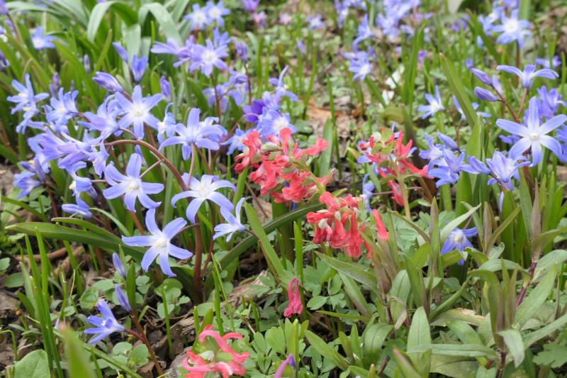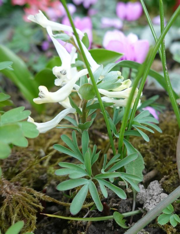 Das linke Corydalis findet sich seit etlichen Jahren im wilden, von mir noch nicht berührten Bereich des Geländes und legt langsam zu. Das rechte ist Corydalis malkensis, steht kürzer als ersteres in einem Streifen mit Cyclamen coum. Was könnte nun das rechte sein? (Ich hatte früher schon mal anderswo, recht weit weg, ein C. malkensis, ebenso ein als C. caucasica bezeichnetes, weiß, beide verschwunden seit langem.)