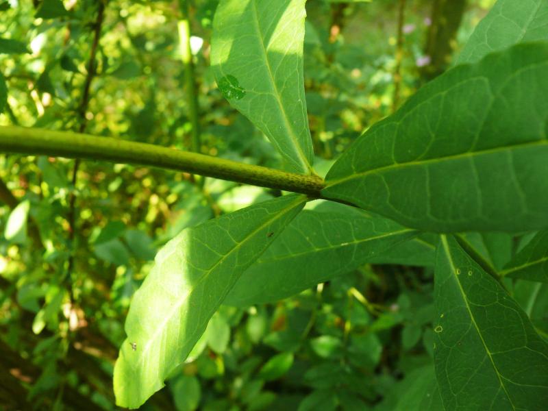 In einer Strauchgruppe tauchte jetzt ein Einstieler-Sämling auf, dessen Blüte , die Wuchshöhe von 180 cm und der punktierte Stängel ´Jeana´ ähneln. Außergewöhnlich sind die 15 mit jeweils drei Blättern besetzten Nodien . Da ´Jeana´ praktisch steril ist, könnte diese Sorte väterlicher Elter des Sämlings sein.