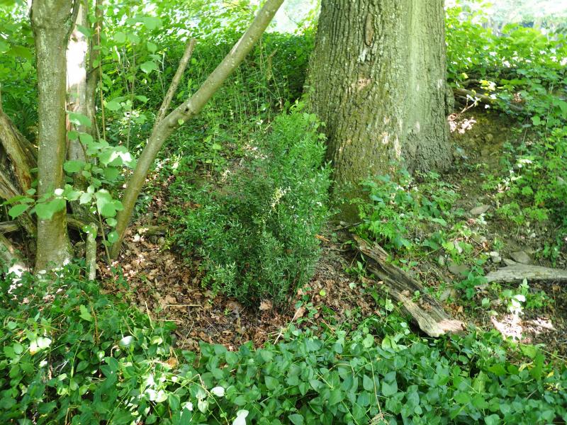 der Bestand meines Mäusedorns, Ruscus aculeatus wächst! So viel zugelegt hat er seit Jahren nicht. Es gibt auch ein paar Sämlinge drumrum. Finde ich super! Nachdem ich wirklich lange auf rote Beeren gewartet hatte und immer mal Exemplare dazu gekauft um endlich rote Beeren zu sehen. Machen die das jetzt alle wie selbstverständlich. Ein schlechtes Bild vom Standort unter der alten Eiche.