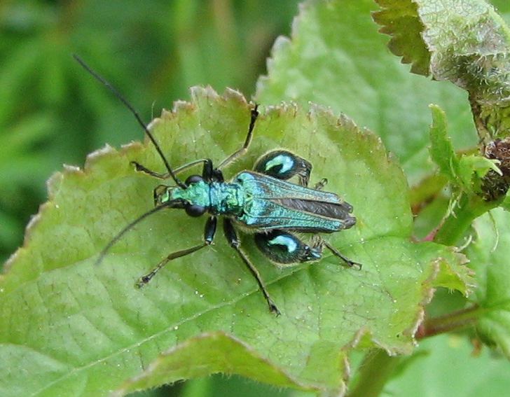 Steinbockkäfer Oedemera femorataCharakteristisch für Steinbockkäfer sind die nach hinten schmaler werdenden Flügeldecken, die den Hinterleib und die Hautflügel freigeben. Ein gutes Geschlechtsmerkmal sind die stark verdickten Schenkel der Männchen.