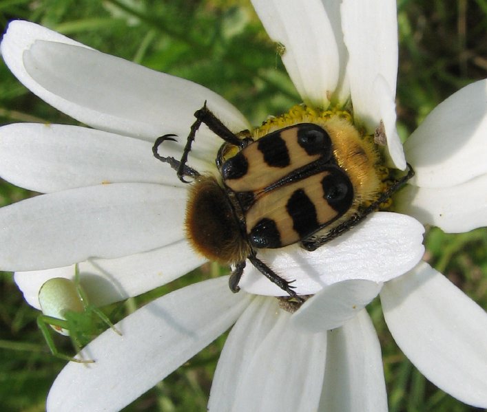 Pinselkäfer Trichius rosaceusVon Juni bis Juli trifft man Pinselkäfer auf Blüten von Disteln, Margeriten, Rosen u.a. an. Wie man sieht, trifft das zu.Während der Aufnahme flog mir ein Goldstaub-Laubkäfer (Hoplia farinosa) auf die Schulter. Ich sagte noch: "Du siehst aus, als hätte man dich mit Blattgold überzogen."