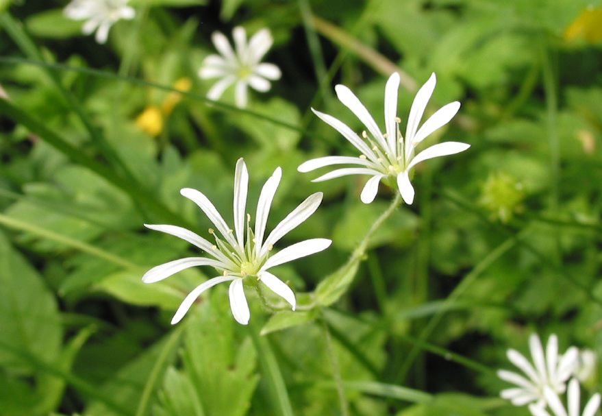 Große Sternmiere Stellaria holosteaDie Pflanze gehört zu den Nelkengewächsen. Krautreiche Laubwälder, Gebüsche und Hecken sind Lebensräume. Lehmige und sandige Böden werden bevorzugt.Neben dieser Art und der Vogelmiere gibt es bei uns sechs weitere Stellaria-Arten.