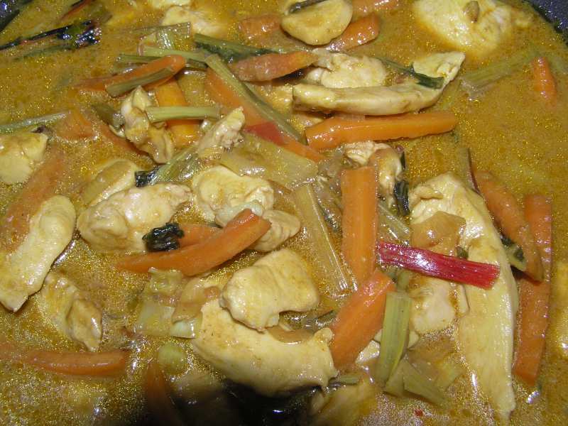 gestern gabs asiatisch.hähnchenbruststreifen mit buntem mangold, karotten, sprossen, kokosmilch und gewürzen.darunter wurden zum schluß glasnudeln gemischt. salat gabs noch dazu.und zum nachtisch schokopudding und frische ananas.hier ein bild...aber fertig ists da noch nicht. die mangoldblätter, die sprossen und die glasnudeln fehlen, die erst zum schluß untergemischt wurden. hab vergessen auf dem teller nochmals ein bild zu machen...