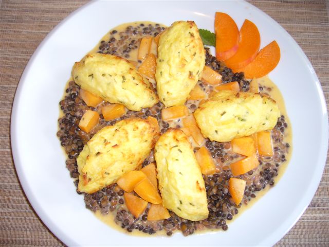 ... es gab:GartensalatKartoffelküchlein auf Linsen mit Aprikosensauce