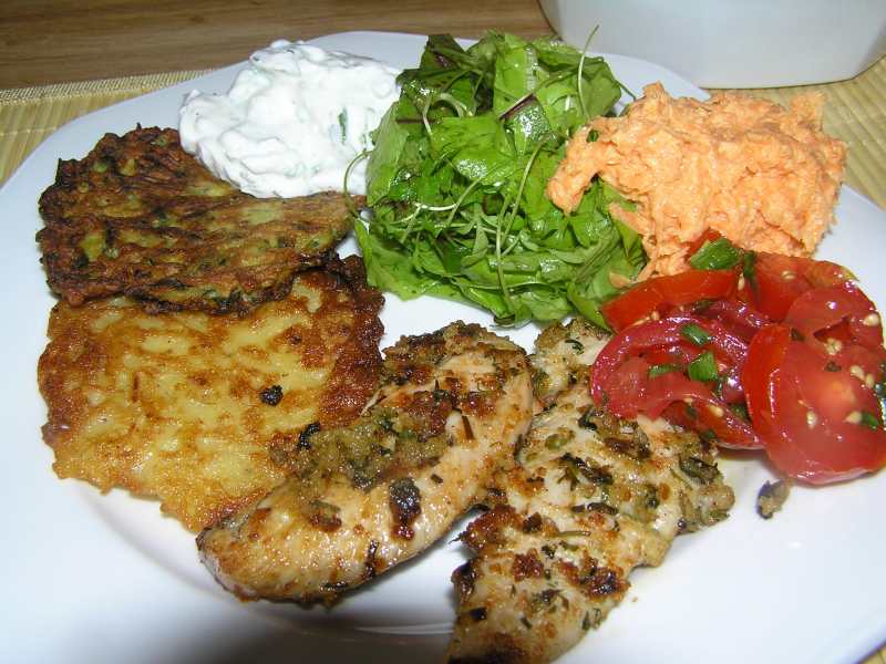 heute gabs mal wieder zucchinipuffer (dein bild hatte mich so angemacht, luna), kartoffelpuffer, gebratene hähnchenbruststreifen, dazu kräuterquark, gartensalat, karottensalat und tomatensalat