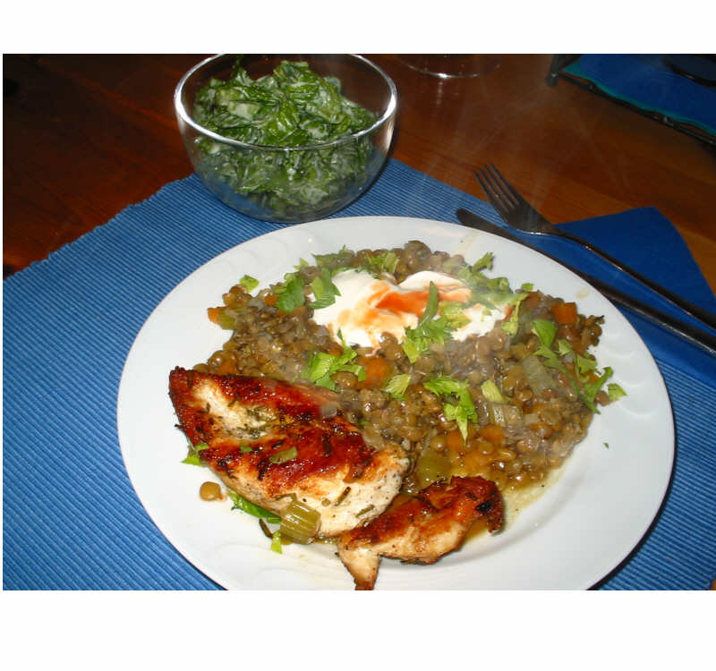 Gestern Linsengemüse mit den letzten frühen Möhrchen und Staudensellerie, Rosmarin-Hähnchenbrust und Gartensalat.
