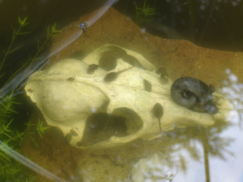 Die Schnecken putzen den Schädel blank. Man sieht eine Posthornschnecke, Spitzschlammschnecken, kleine Sumpfdeckelschnecken, und Kaulquappen. Die Sumpfdeckelschnecken sind erst kürzlich auf die Welt gekommen, sie sind lebendgebärend.