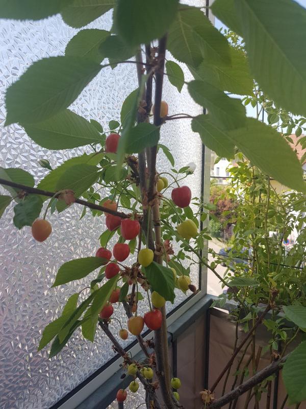 Hallo, vielen Dank für die vielen Antworten! Hier ein Foto, die Kirschen reifen unterschiedlich aus, deshalb sind manche noch grün oder gelb. Aber je weiter sie kommen, desto röter werden sie :o.