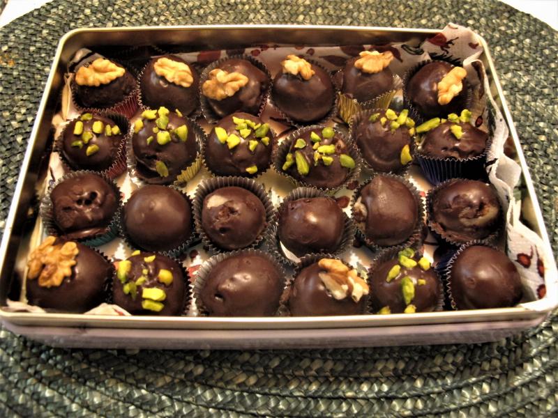 Honigmarzipankugerl, leicht alkoholisch und mit 78%iger Schokolade getunkt: