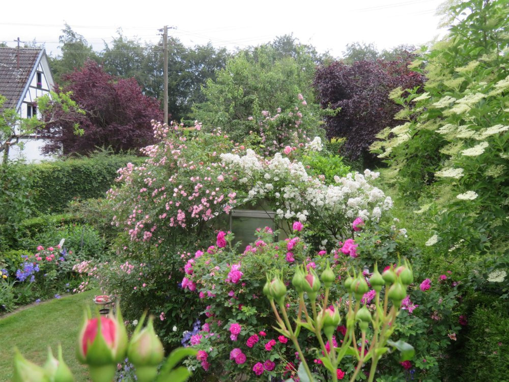 (Auch wenn ich selbst mit Rosen nicht viel anfangen kann: sehr beeindruckende Anlage! Rosen sehe ich mir gerne in anderen Gärten an, verzichte jedoch weitgehend im eigenen Garten darauf, zumal die hiesigen Voraussetzungen - saurer Sandboden und hohe Luftfeuchtigkeit - suboptimal für diese Gewächse, aber optimal für Rosenbäume (Rhododendron) sind )