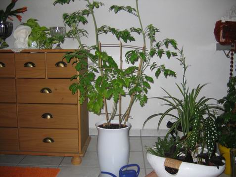 Hallo ...unser Wz hat 2 große normale Fenster und 2 Dachfenster mit Süd/West Ausrichtung.Unter diesensteht Campari-allerdings erst seit ca.5 Tagen.Blöderweise habe ich die Triebenden nicht im Bild-dort sieht man,das die Blattabstände kürzer werden.Licht von oben ist einfach besser.Ach,was mich total erstaunt,es ist keine Weiße Fliege zu entdecken !!! Damit hatte ich nämlich gerechnet...Bin mal gespannt,wann sich die Tomaten verfärben...und wie das mit meinen bewurzelten Geiztrieben klappt ???L GKnolli