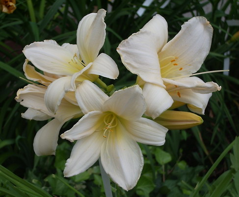 Hier das versprochene Foto von Serene Madonna, welche vor ein paar Tagen gleich im Viererpack aufgelaufen ist und damit bestenfalls demonstriert hat, warum es in der modernen Taglilienzucht darum geht, Verzweigungen an die Blütenstängel zu züchten: um das Chaos im Blütenknäuel am Stängelende zu beseitigen.
