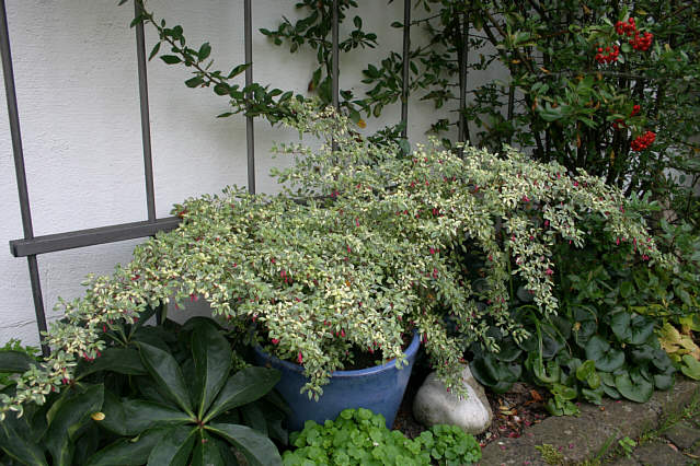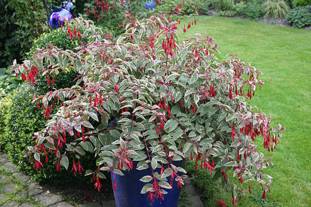 Diese kleinblättriege panaschierte Fuchsie hat sich heuer wunderbar entwickelt. Sie ist im Winter heikel zum überwintern.