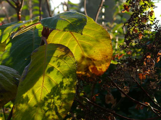 In einer tiefen Schattenecke hat Hydrangea arborescens die erbleichten Blätter fallen gelassen. Ziemlich geisterhaft.