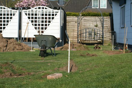 Monate sind ins Land gegangen..... wir haben hin und her überlegt, gezeichnet, angeschaut, Pläne gemacht......Ach ja PLÄNE!!!!!Sie sind auch nur dazu gut, um sie wieder zu verwerfen! ;DJetzt haben wir endlich "Nägel mit Köpp" gemacht..... gestern ging es los.......der erste Spatenstich, bzw. der erste Bauabschnitt....Nachdem wir die Fläche abgesteckt hatten, GöGa "geheimnisvolle Schnüre" gezogen hatte....