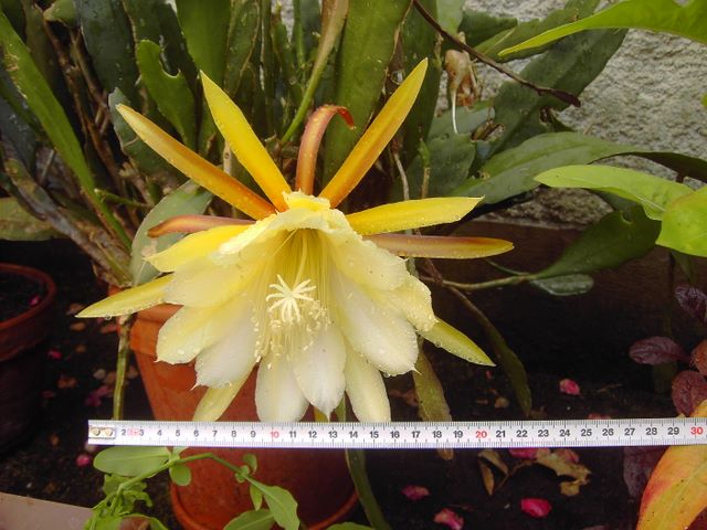 dieser Blattkaktus, wenn es der ist, den wir hatten, von dem ich jetzt meine, dass es Epiphyllum oxypetalum ist, den hatten wir im Wohnzimmer. Also im Winter voll Zentralheizungsluft direkt unter dem Fenster, auf dem das Monster stand. Solch einen Fensterplatz habe ich im neuen Haus gar nicht mehr.