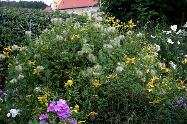 Jetzt kommen die viticella-Sorten. Die mag ich am liebsten. Da gibt es eine wahnsinnige Vielfalt und die kommen mit der Sonne am besten zurecht. Die mögen es heiß.lg. elis