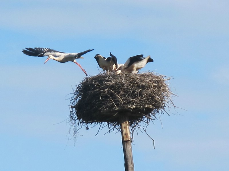 Zwei Wochen später machen die Störche emsig Flügelgymnastik. Sie stellen sich in den Wind, wedeln mit den Flügeln und springen hoch. Ein bisschen beengt geht es dabei zu.