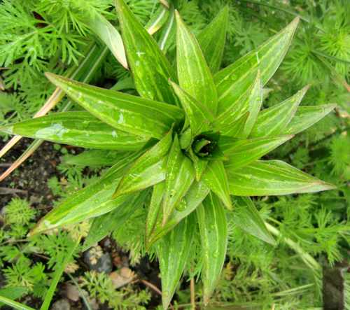 An der Stelle hat sie einige Oriental-Hybriden und einige unserer berühmten Strassenlaternen gepflanzt.Diese Lilie ist ihr aufgefallen, weil sie nicht zu den anderen passt. Geblüht hat sie noch nie bewusst.Es ist offensichtlich die einzigste Lilie im ganzen Garten mit diesem Erscheinungsbild.
