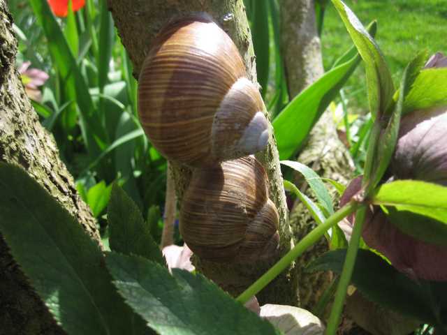 Bei mir stecken in den Staudenhorsten überall die halbverbuddelten Weinbergschnecken, sie lugen oft ein Stück aus der Erde heraus. Die Eingänge sind noch mit den Kalkdeckelchen vom Winter verschlossen, aber so allmählich werden diese rausgetrennt und die Schnecken erwachen zu neuem Leben.