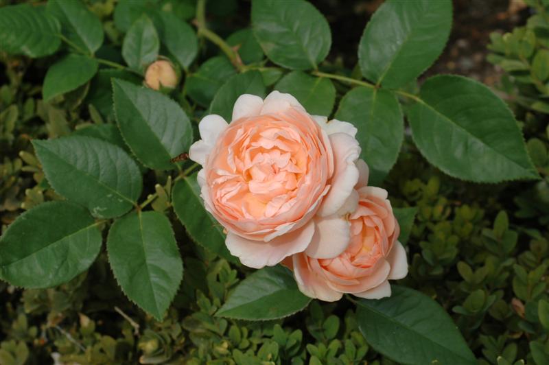 'Ambridge Rose', etwas anlehnungsbedürftig an den Buxrand . Hat leider im Winter sehr gelitten und nun erst nur einen Trieb, aber überlebt!