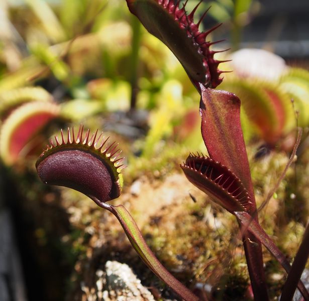 Dann habe ich noch eine wirklich schöne rote Dionaea, die erstens blüht und zweitens sich zu teilen beginnt. Davon landet auch eine im Moorbeet.