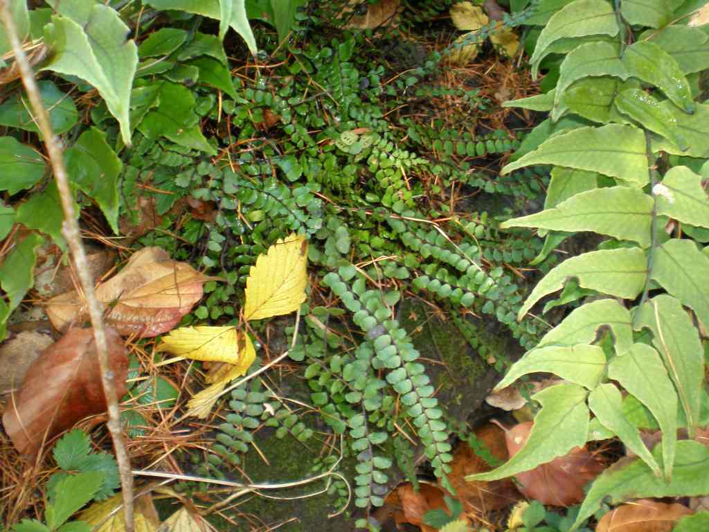 der braune streifenfarn kuschelt sich unter den sichelfarn und fühlt sich dort sehr wohl.