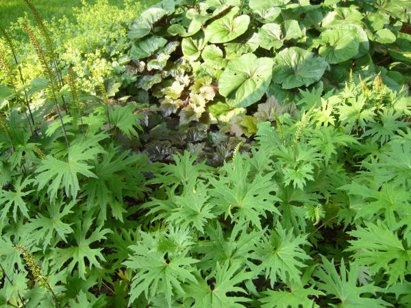 Ligularia przewalskii + Ligularia dentata + Heuchera + Alchemilla mollis