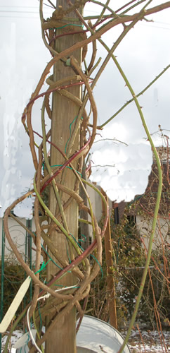 Und hier sieht man - leider nicht sehr gut, wie die Weidenruten gebunden sind. Sie sind wohl kräftiger als meine roten Locken. Sie werden auch sehr fest gebunden. Der Saftstau soll dazu beitragen, dass die Pflanzen über die ganze Länge blühen.