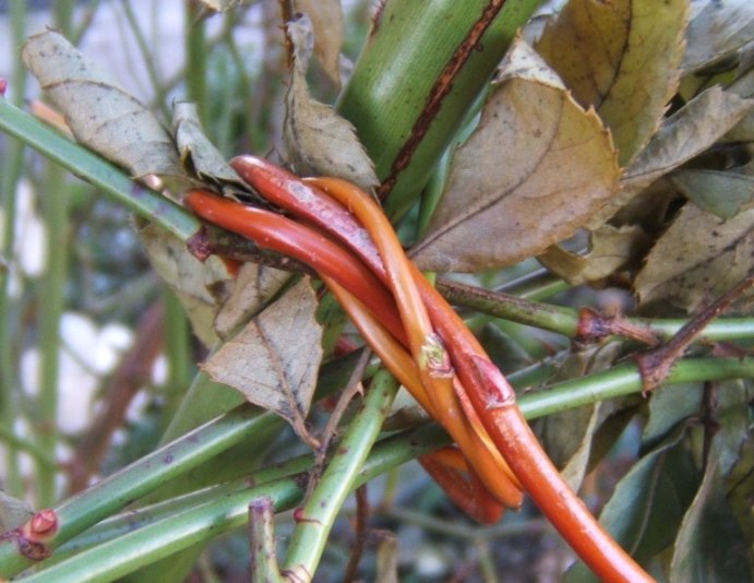 Ich habe heute schon mal geübt. Rosa hugonis am Pfosten festgezurrt. Die dünnen, peitschenartigen Weidentriebe lassen sich gut knoten. Sie rutschen aber bei einfachem Knoten, mehrfach umeinanderwickeln, dann hält's.