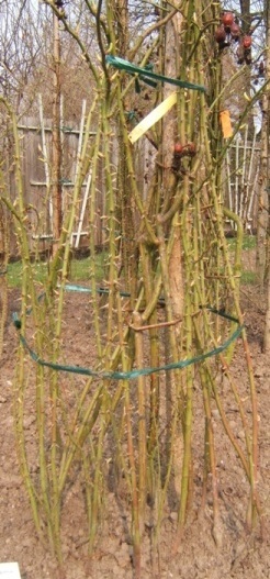 Und hier sieht man die enge Binde aus Weide (im Frühling des Vorjahres nach dem Schnitt angelegt) und der neue Jahresaustrieb mit dem breiten Band gebändigt.Das war im April, vor dem Schnitt und erneutem festbinden.
